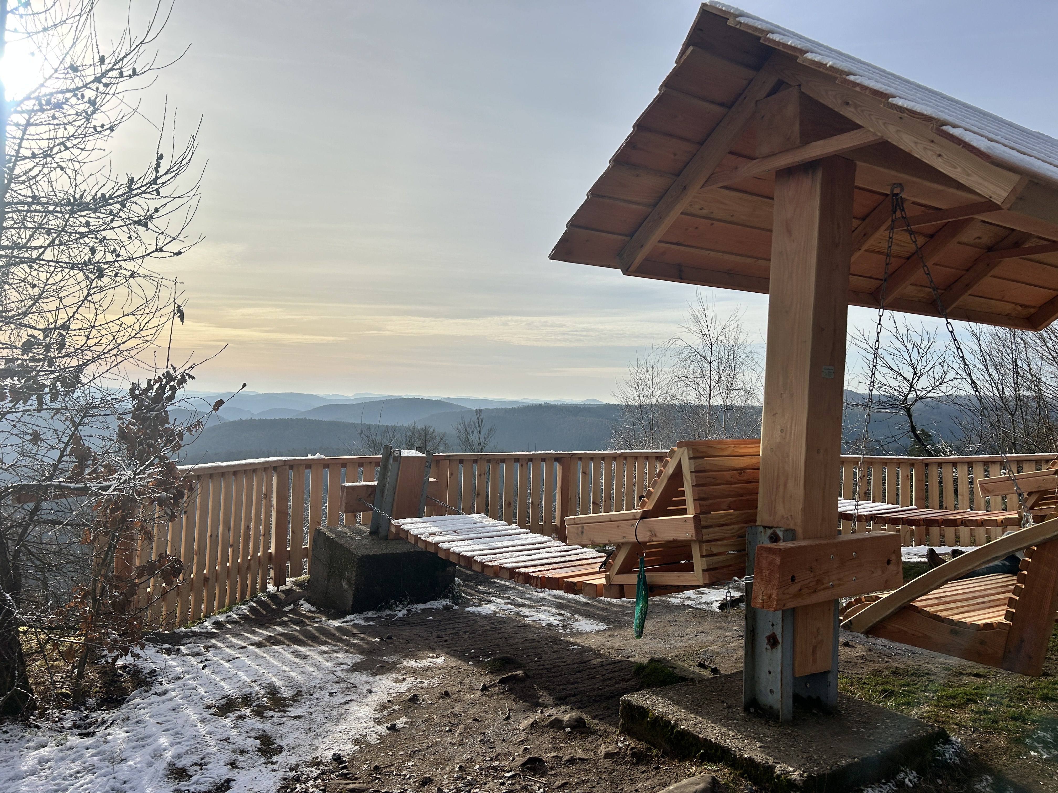 Bei der potentiellen Einkehrmöglichkeit, dem Forsthaus Schwarzer Fuchs, steigen wir in die mittelschwere Wanderung im Pfälzerwald ein und orientieren uns an der Markierung des Rundwanderweg Nummer 3. Auf einem gut ausgebauten und gemütlichen Waldweg kommen wir nach 2 km schnell zum Kirschfelsen. Nachdem wir das beeindruckende Panorama von der Holzschaukel aus genossen haben, gehen wir ein paar Schritte zurück wie gekommen und folgen nun dem Weg nach rechts. Auf schmalen Serpentinen geht es steil bergab, bis wir zur Schutzhütte „Rotsuhlerhütte“ gelangen. Es geht nun nach links weiter auf einem überwiegend gemütlichen Waldweg, bis wir zu einem markanten Schilderbaum kommen.